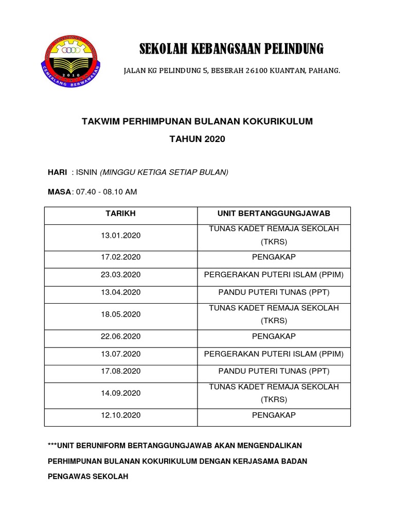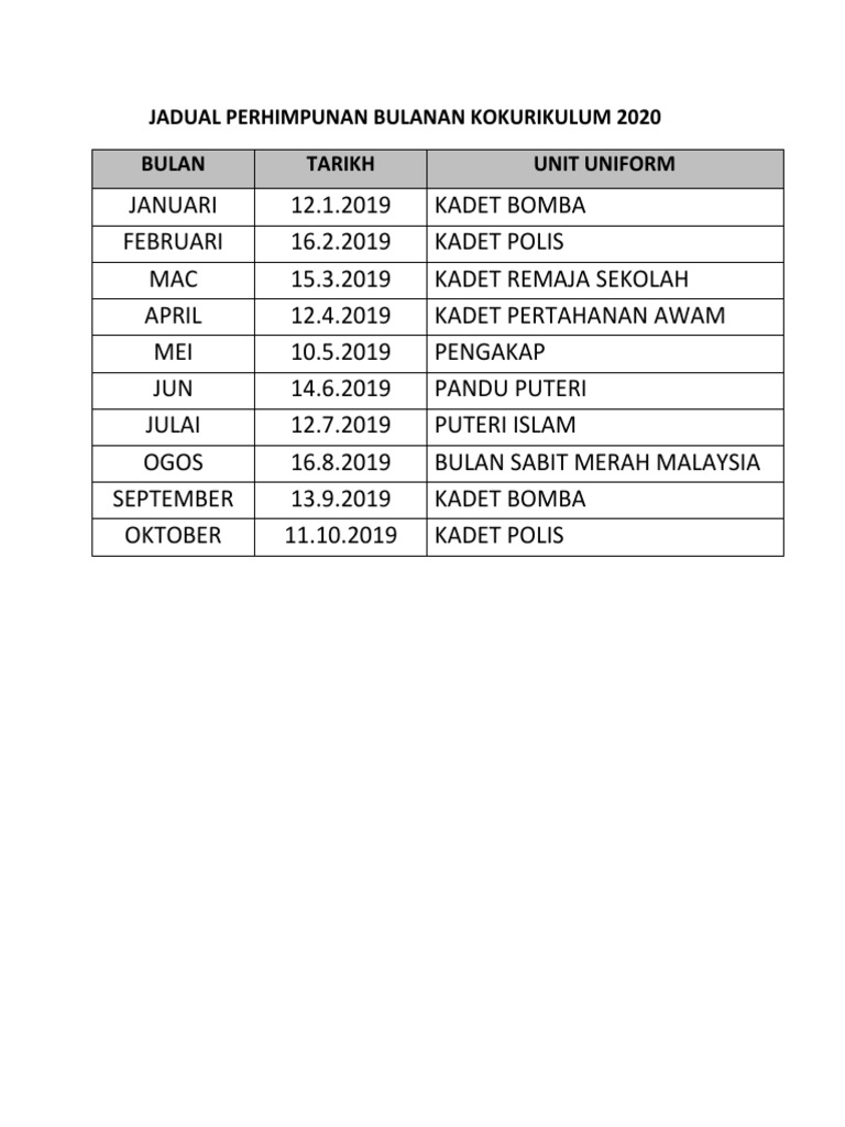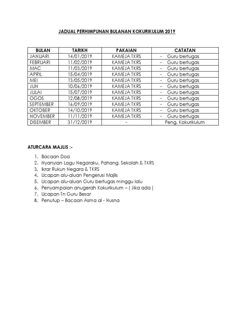 Kem kepimpinan unit kokurikulum 2019. .2019 4.5 perhimpunan bulanan kokurikulum 2019 4.5.1 beliau turut menyatakan perhimpunan kokurikulum bulanan akan dijalankan pada setiap tindakan: Pengisian enrolmen bulan januari 2019. Bulan tarikh unit beruniform catatan. Perhimpunan kokurikulum bulan mac oleh badan beruniform tkrs.